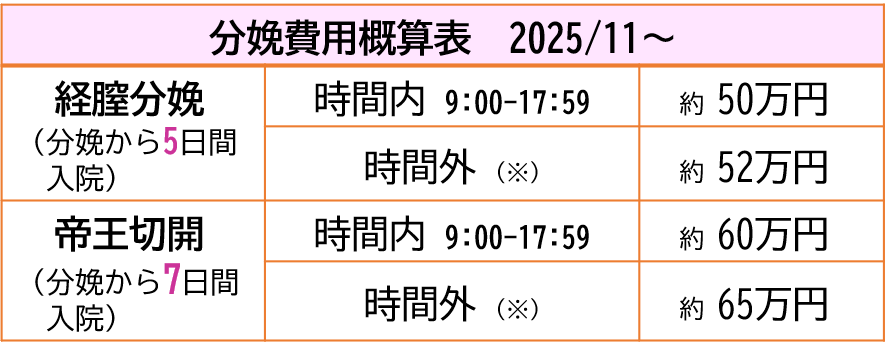 3.診療内容、分娩時間帯(休日など診療時間外)により、概算は前後しますので、予めご了承ください。